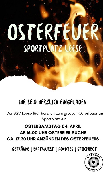 Am Samstag, den 04. April 2026, wird auf dem Leeser Sportplatz in den Abendstunden das Osterfeuer entzündet. Davor findet das Ostereiersuchen für die kleinen Besucher statt. Wobei es nicht schlimm ist, wenn die großen Besucher den Kleinen bei der Suche helfen. Hauptsache es werden alle Eier gefunden und müssen nicht ein Jahr im Versteck liegenbleiben, um 2027 endlich gefunden zu werden.